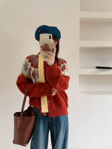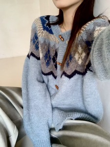 复古费尔岛牛角扣毛衣外套女秋季新款慵懒风圆领软糯针织开衫上衣