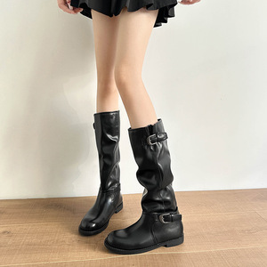 董洁同款长筒拼接堆堆靴麂皮圆头中筒靴子春秋新款两穿骑士靴子女