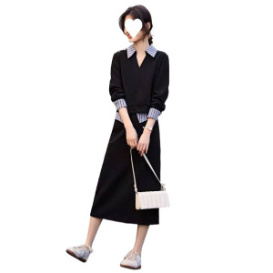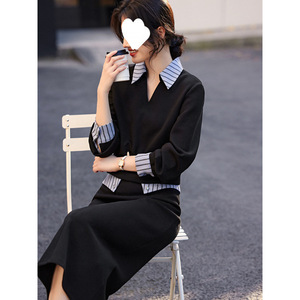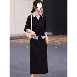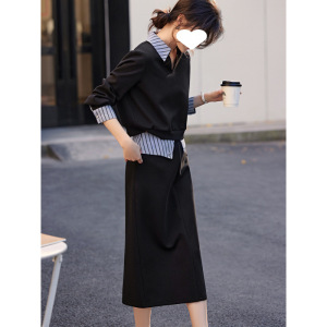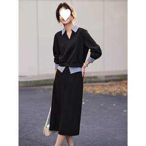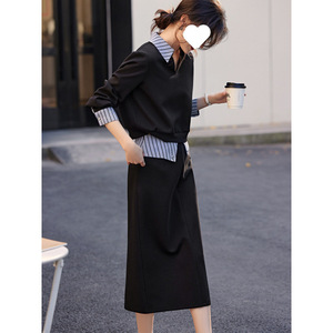 网红爆款拼接设计衬衫领卫衣套装女秋季新款休闲简约半身裙两件套