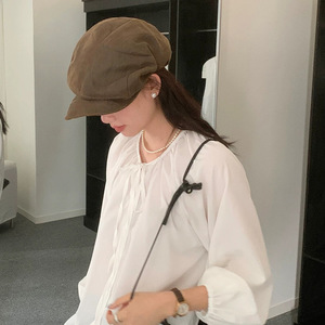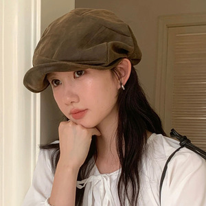 板栗咖色褶皱八角帽日系复古做旧小众时髦感显脸小软檐文艺报童帽