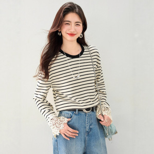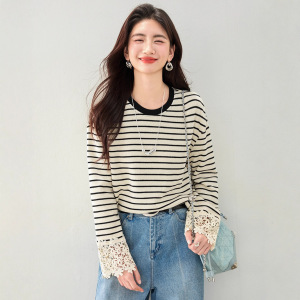 2025秋季新款韩系宽松圆领撞色条纹长袖T恤女蕾丝拼接袖针织上衣