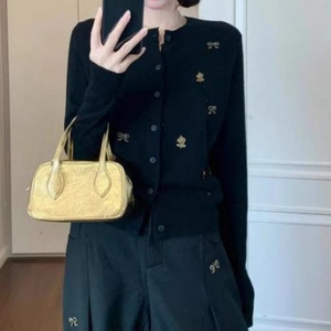【店铺热销】高级感气质黑色蝴蝶结针织开衫外套法式复古上衣女长