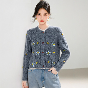 2025秋冬款韩版小花刺绣灰色开衫毛衣女小个子短款保暖长袖针织衫