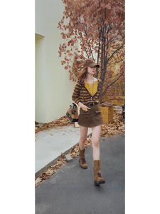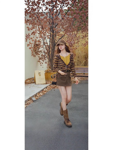 2025新款秋季时尚一整套复古假两件条纹针织衫高腰短裙两件套装女