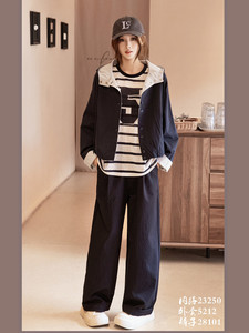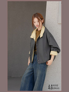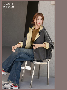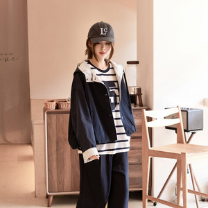 秋季新款时尚深蓝色连帽宽松短外套撞色藏蓝色开衫休闲长袖短上衣