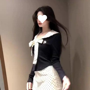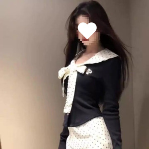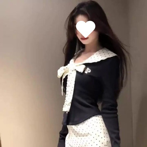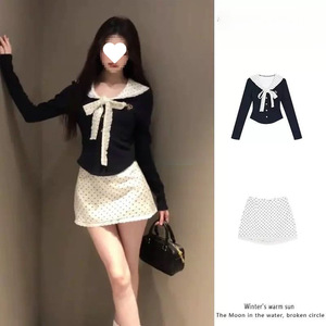 甜辣风蝴蝶结绑带恤套装女秋高腰波点包臀半身裙修身长袖上衣