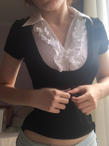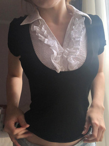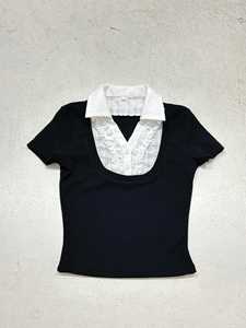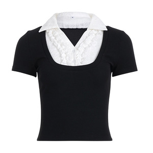 新款法式复古甜美风拼接蕾丝显瘦撞色假两件POLO领肌理料T恤上衣
