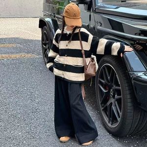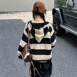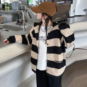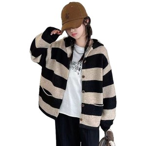 女孩条纹连帽撞色开衫中大童春秋新款时尚单排扣百搭甜美复古外套