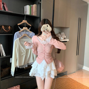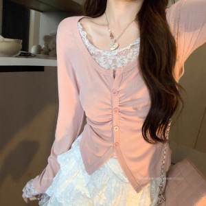 大码假两件网纱拼接长袖T恤2025秋季胖mm设计感收腰显瘦上衣
