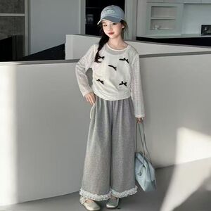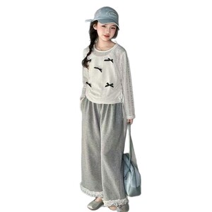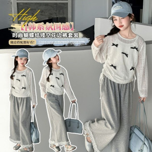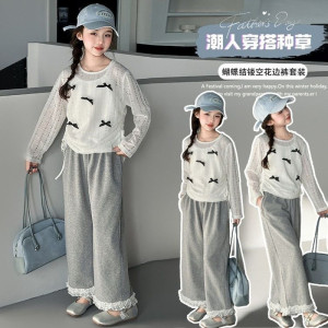 女童慵懒风镂空上衣儿童洋气套装中大童春秋新款蝴蝶结时尚三件套
