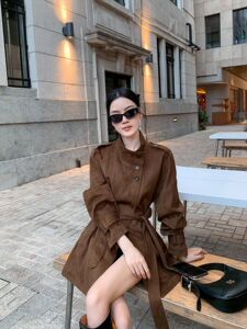 复古美拉德立领麂皮中长款风衣女2025秋新款修身显瘦气质时尚外套