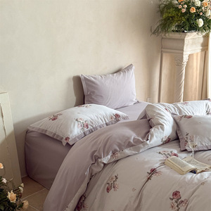 法式复古花卉100S长绒棉磨毛四件套简约拼角被套秋冬高级感床品
