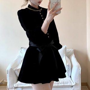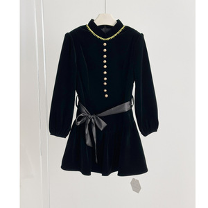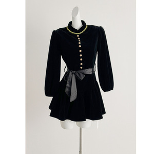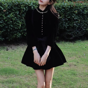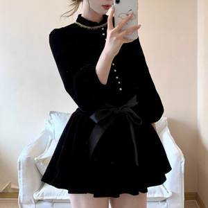 2025秋季新款 伯拉德千金 赫本风黑色丝绒长袖连衣裙秋季修身短裙