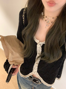 ASHENONLINE 堂吉诃德 拼色针织小开衫秋季复古设计感休闲上衣女