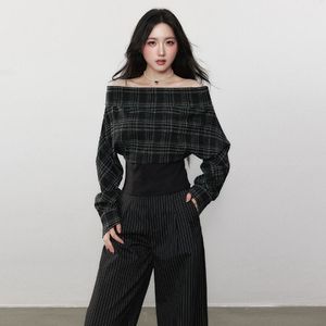 慵懒风简约秋季款黑白撞色格纹设计一字肩修身收腰时尚长袖上衣女