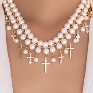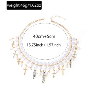 复古多层仿珍珠项链欧美时尚小众设计感镶钻十字架组合吊坠锁骨链