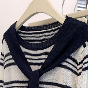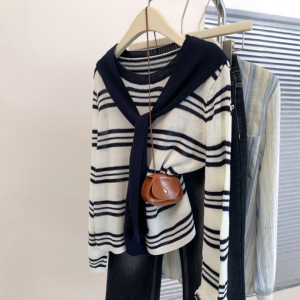 藏青色披肩复古条纹长袖针织衫毛衣女2025秋冬新款叠穿两件套上衣