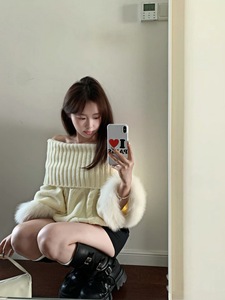 潇潇同款慵懒感觉 粗针针织毛衣拼接拆卸狐狸毛袖口皮草古着氛围