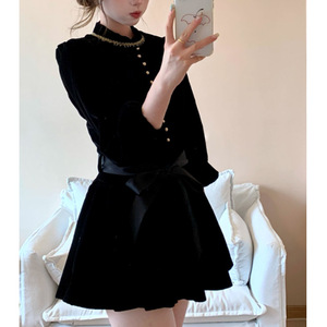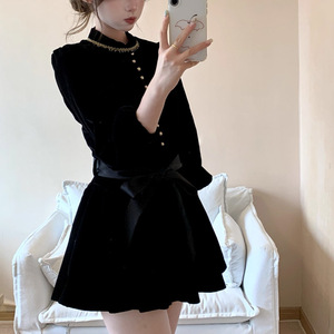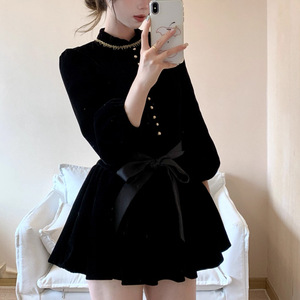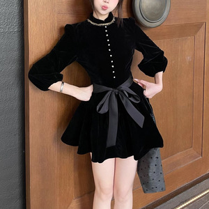 伯拉德千金 赫本风黑色丝绒长袖连衣裙秋季高腰A字短裙子2025潮