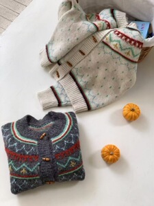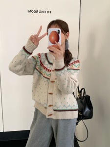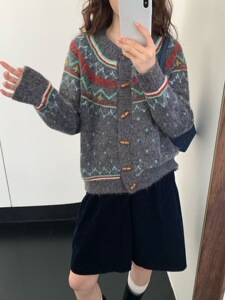 复古北欧风费尔岛牛角扣毛衣外套女秋冬圣诞慵懒软糯针织开衫上衣