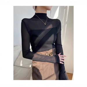 半高领蕾丝网纱打底衫女长袖2025新款春秋t恤内搭外穿高级感上衣