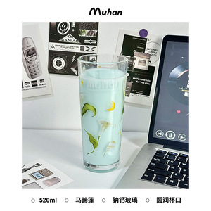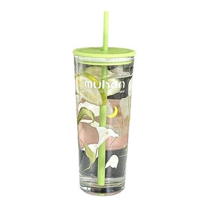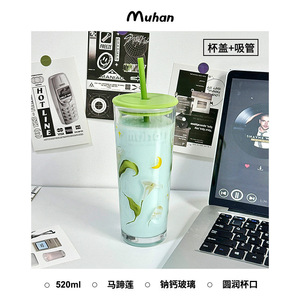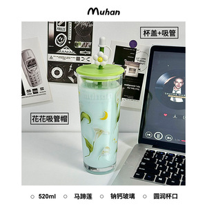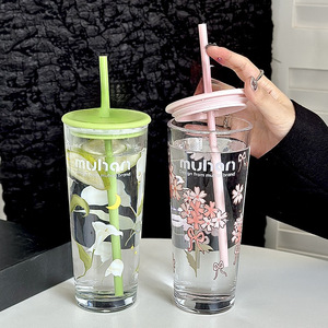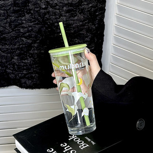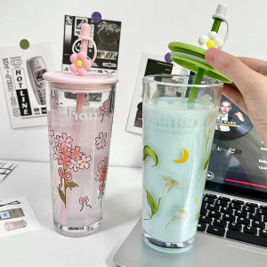 学生高颜值泡茶杯水杯子办公室咖啡杯大容量玻璃杯简约花卉吸管杯