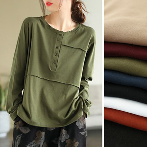 新款文艺复古春秋季长袖恤女休闲显瘦拼接纽扣打底衫上衣女2025