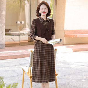 中老年女装假两件裙子洋气大码妈妈装格子翻领过膝中长款连衣裙