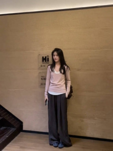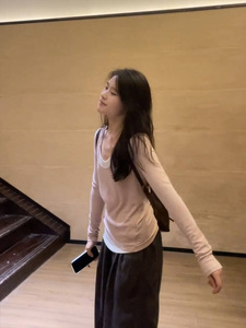 韩系温柔粉色假两件长袖T恤女秋2025新款修身慵懒U领打底衫上衣