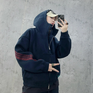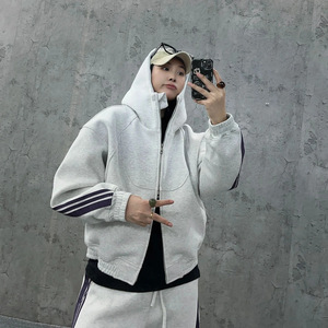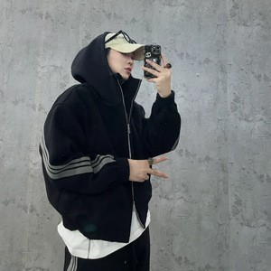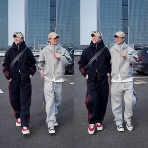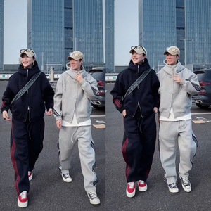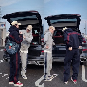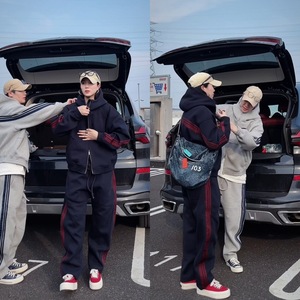 尹小鸡 重磅短阔版型三条杠拼接连帽卫衣帽衫休闲运动男女款套装
