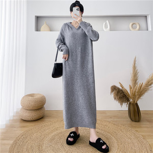 长款配大衣针织连衣裙女秋冬新款宽松慵懒V领打底内搭毛衣裙长裙
