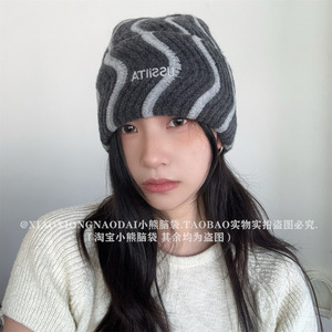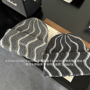 韩国潮酷男女同款针织冷帽纯羊毛翻边显脸小休闲波浪毛线帽子秋冬