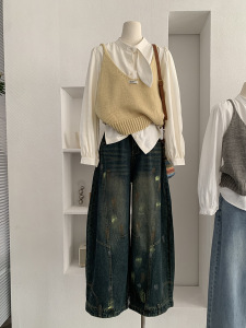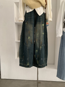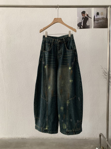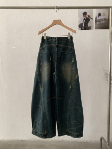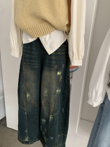 欧玛莱 复古脏染阔腿牛仔裤女秋季宽松显瘦设计感弯刀裤子潮 4896