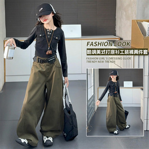 女童2025秋街舞潮牌网红童装腰带工装裤短款紧身上衣爵士舞练功服
