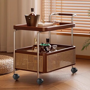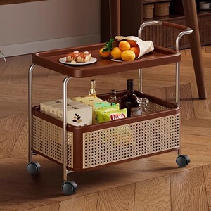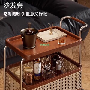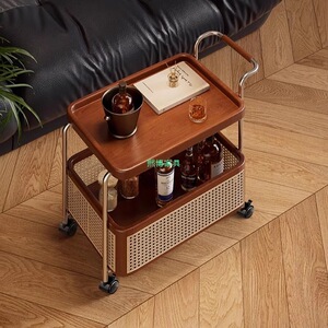 实木可移动边几收纳中古风小推车客厅沙发储物置物架藤编零食餐车