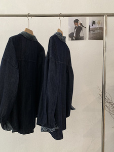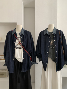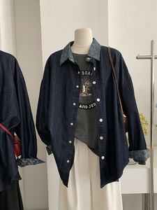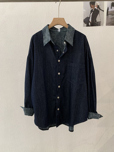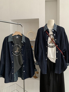 欧玛莱 韩版时尚拼接牛仔衬衫女秋季新款中长款宽松长袖上衣 4646