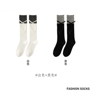 堆堆袜子女秋冬拼色大蝴蝶结双针木耳边小腿袜日系jk洛丽塔长筒袜