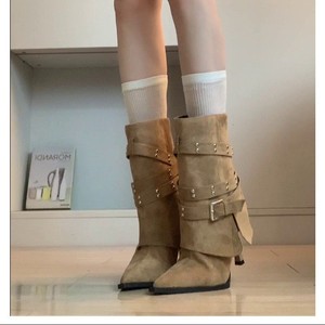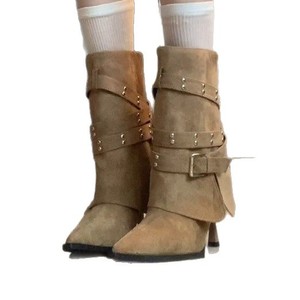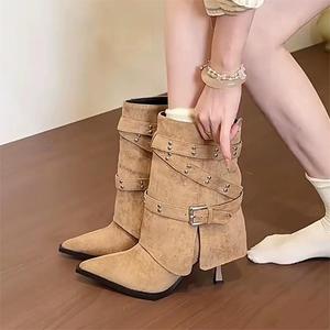 辣妹尖头裤管靴女款2025秋季新款细高跟靴皮带扣复古显瘦短筒靴子