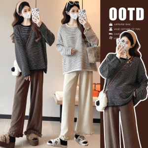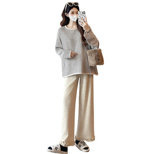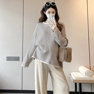 孕妇装秋冬圆领条纹毛衣时尚休闲宽松显瘦百搭上衣+阔腿裤两件套
