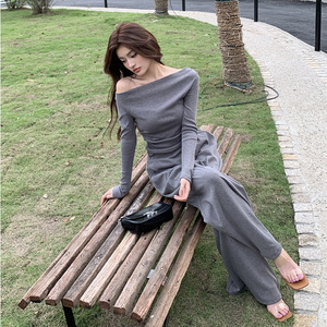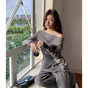 实拍2025秋冬新款长袖两件套装女露肩不规则上衣松紧腰阔腿裤长裤