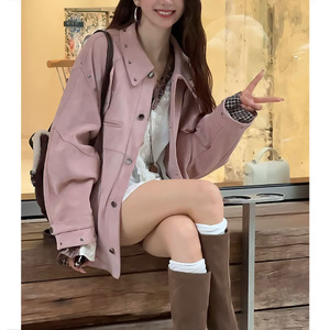 美拉德重工铆钉设计感服外套女2025春秋款美式复古棕色工装夹克潮