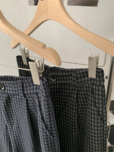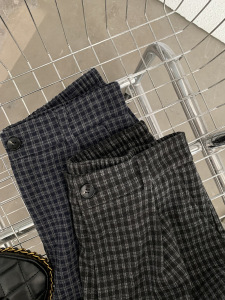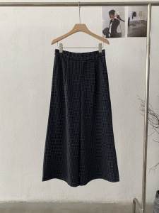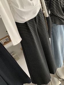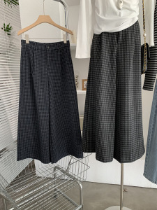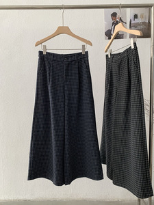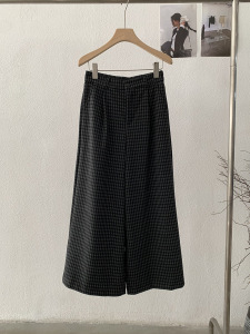 欧玛莱 半松紧高腰格子阔腿裤女宽松直筒休闲裤毛呢九分裤潮 4823