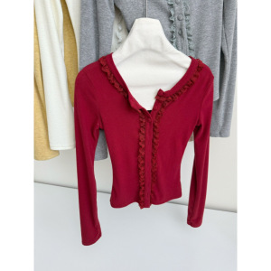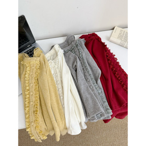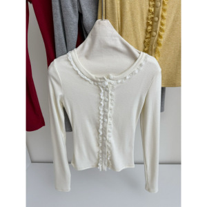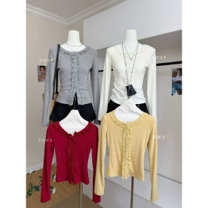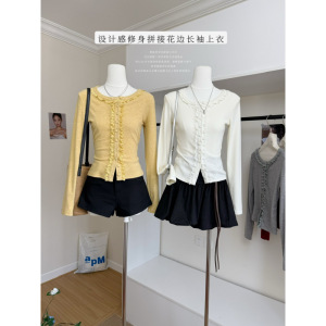 塞纳2025秋季新款多色针织开衫女设计感秋冬修身拼接花边长袖上衣