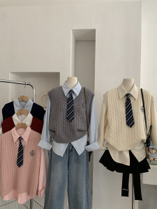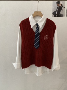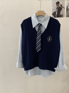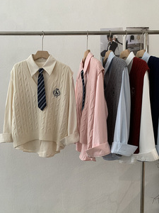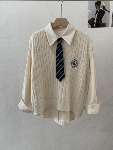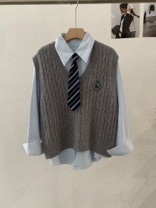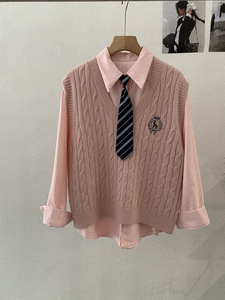 欧玛莱 学院风套装长袖衬衫女刺绣针织V领马甲叠穿上衣配领带4861