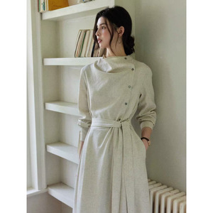 高级感长袖斜门襟连衣裙女秋知识分子风收腰裙