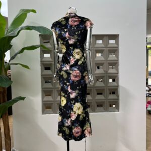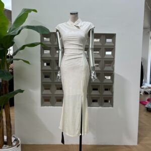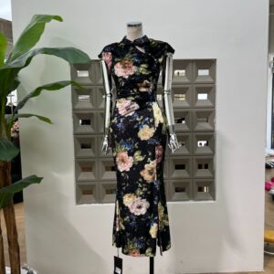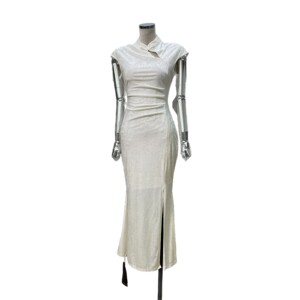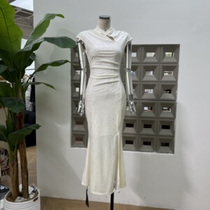 亚马逊优雅宴会盘扣旗袍领收腰修身连衣裙时髦派对长款丝绒礼裙