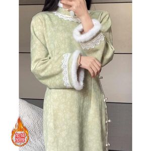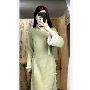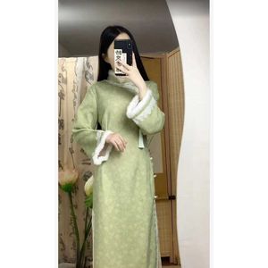 复古民国风倒大袖旗袍秋冬新款少女日常修身绿色改良新中式连衣裙