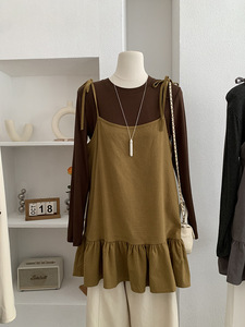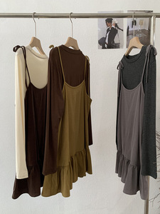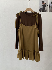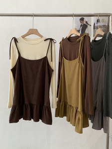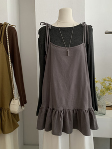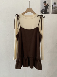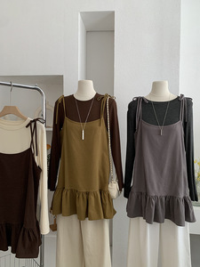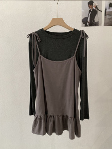 欧玛莱 韩系纯色圆领长袖T恤+绑带吊带背心两件套上衣秋款女 4863