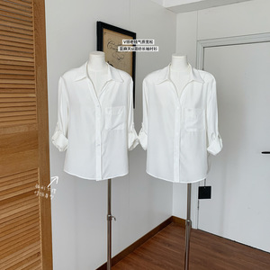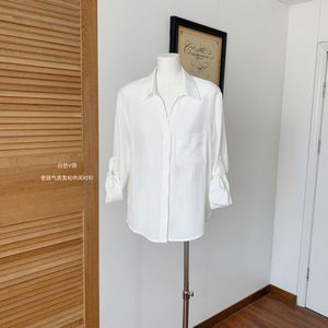 白色V领老钱气质宽松休闲慵懒感亚麻天丝混纺长袖衬衫衣