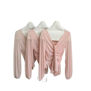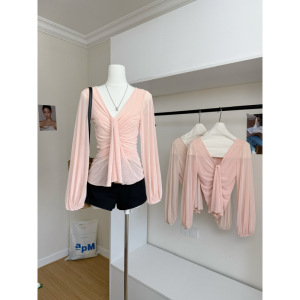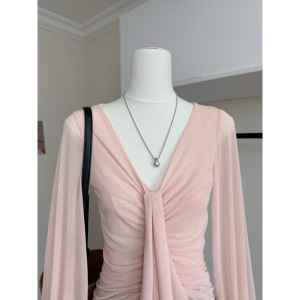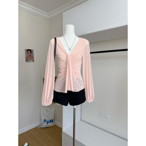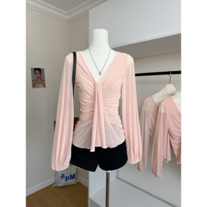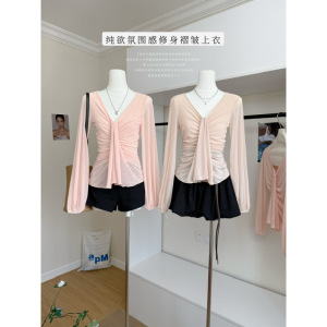 塞纳2025秋季新款温柔纯欲氛围感修身褶皱V领弹力长袖T恤上衣